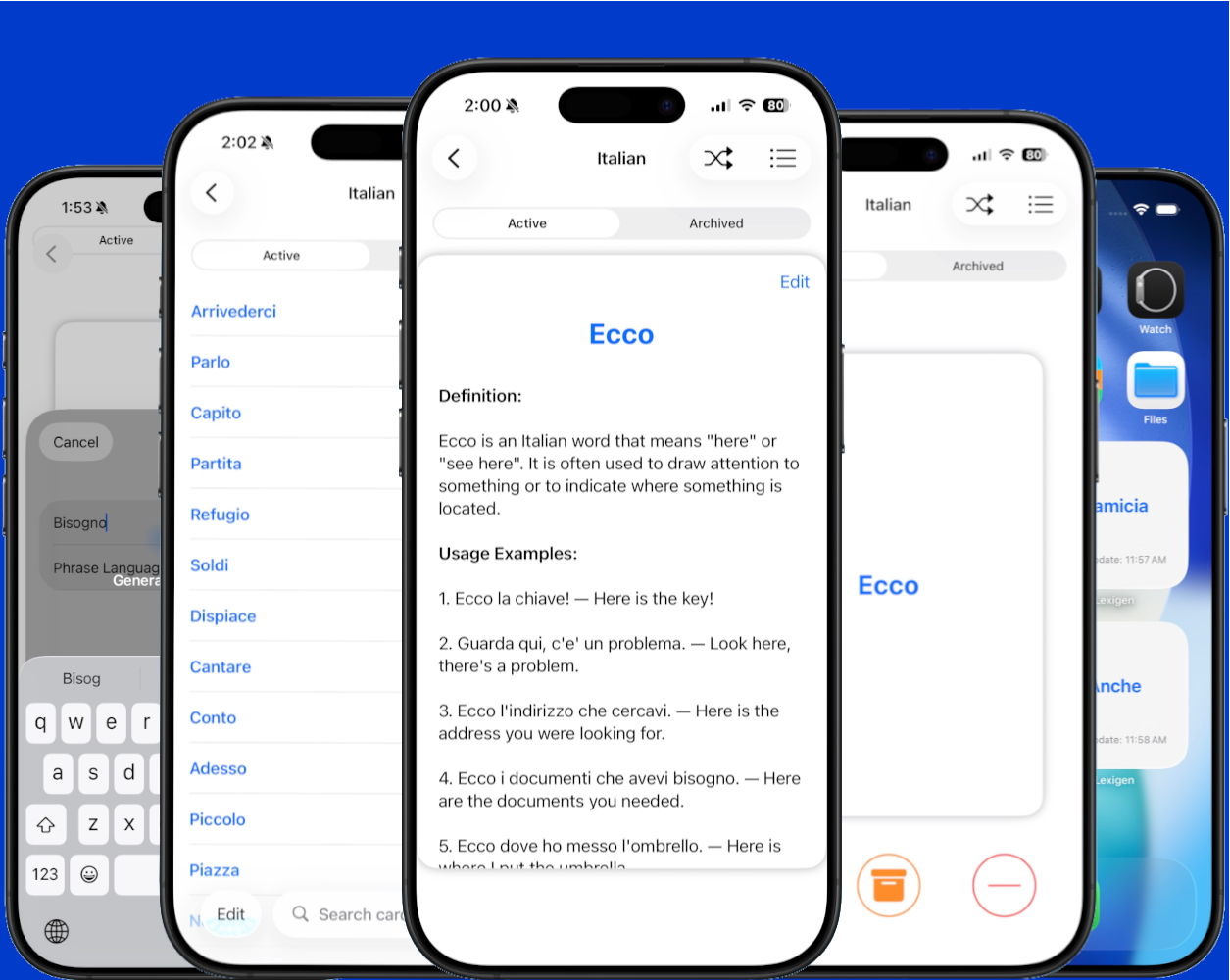 AI-powered flashcards for language learning - Definition and usage examples automatically generated by Apple’s on-device foundation models.